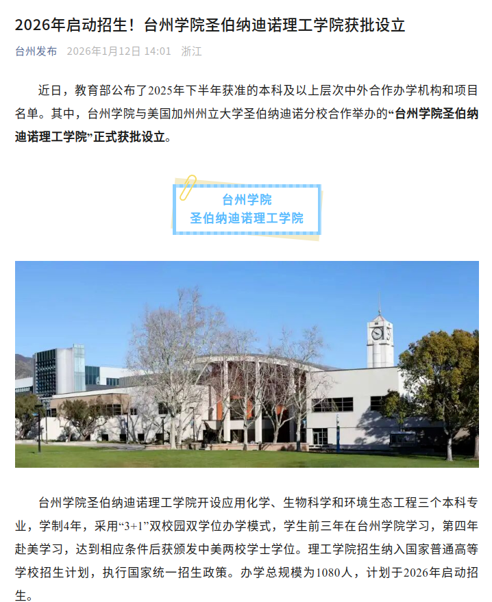 近日,教育部公布了2025年下半年获准的本科及以上层次中外合作办学机构和项目名单。其中,台州学院与美国加州州立大学圣伯纳迪诺分校合作举办的“台州学院圣伯纳迪诺理工学院”正式获批设立。