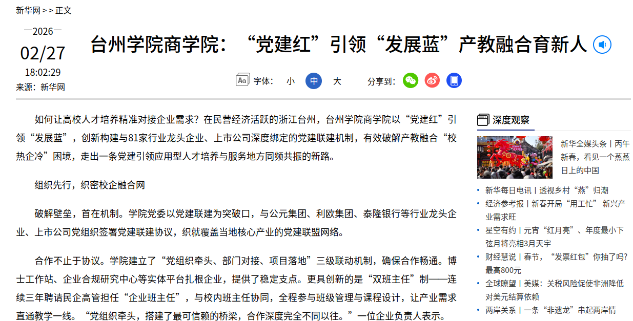 台州学院商学院以党建联建为创新抓手,成功探索出一条“党建引领、校企协同、实战育人、服务地方”的深度融合之路。通过建立校企党建联盟,将组织优势有效转化为育人优势和发展优势,实现了高校人才培养与地方产业需求的精准对接。这一实践为地方应用型高校破解产教融合“两张皮”难题提供了可资借鉴的示范。其经验表明,新时代高校要实现高质量发展,必须坚持和加强党的全面领导,将党的建设深度融入办学治校全过程,以高质量党建引领高质量育人,为区域经济社会发展培育更多“懂产业、能创新、接地气”的应用型人才。(吴佳妲陈斌岚)