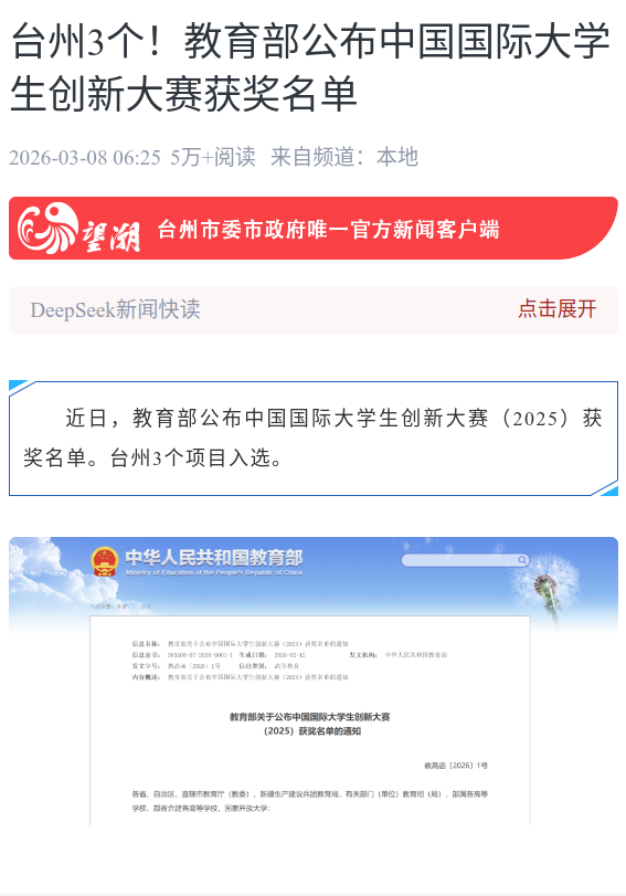 近日,教育部公布中国国际大学生创新大赛(2025)获奖名单。台州3个项目入选。