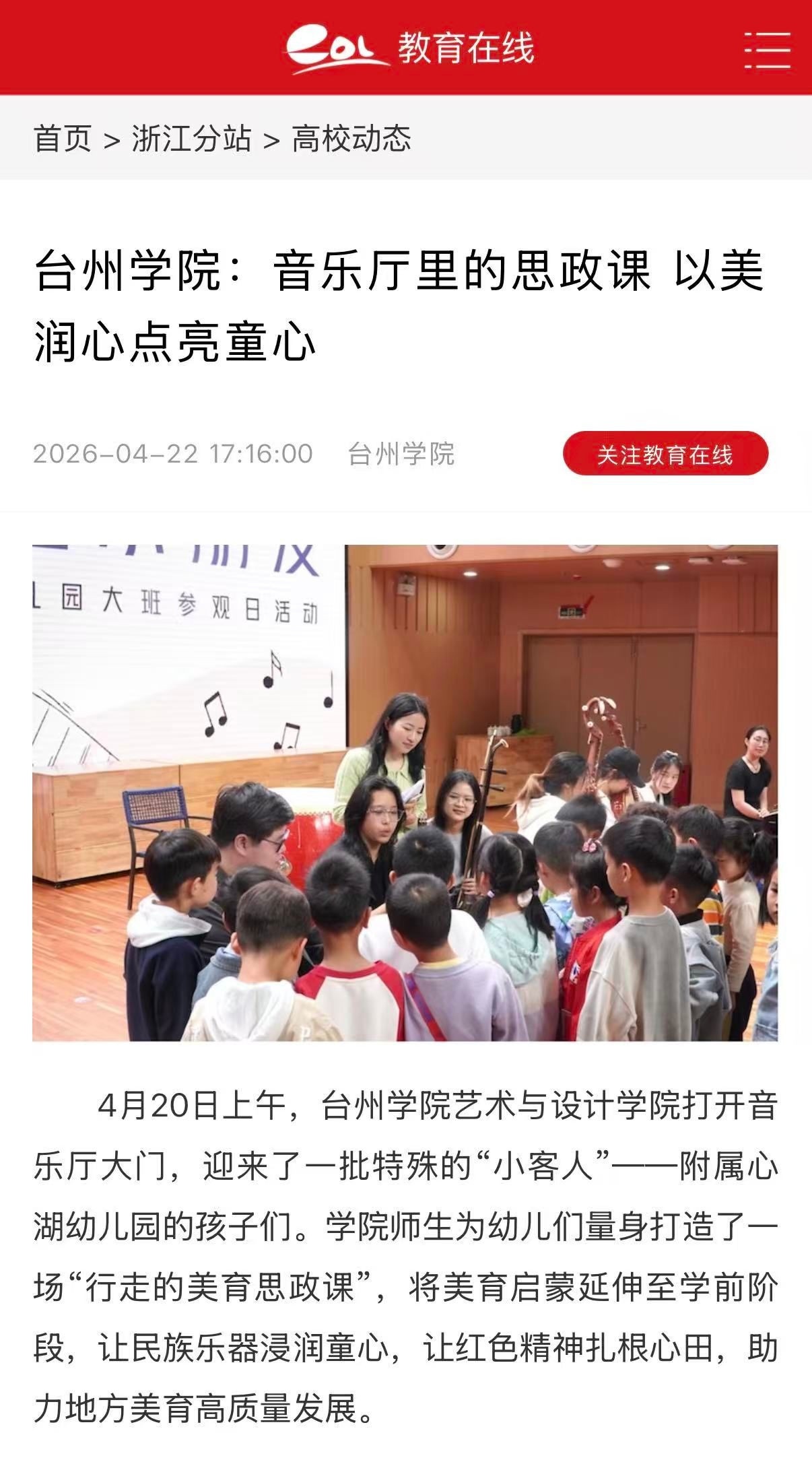 4月20日上午,台州学院艺术与设计学院打开音乐厅大门,迎来了一批特殊的“小客人”——附属心湖幼儿园的孩子们。学院师生为幼儿们量身打造了一场“行走的美育思政课”,将美育启蒙延伸至学前阶段,让民族乐器浸润童心,让红色精神扎根心田,助力地方美育高质量发展。