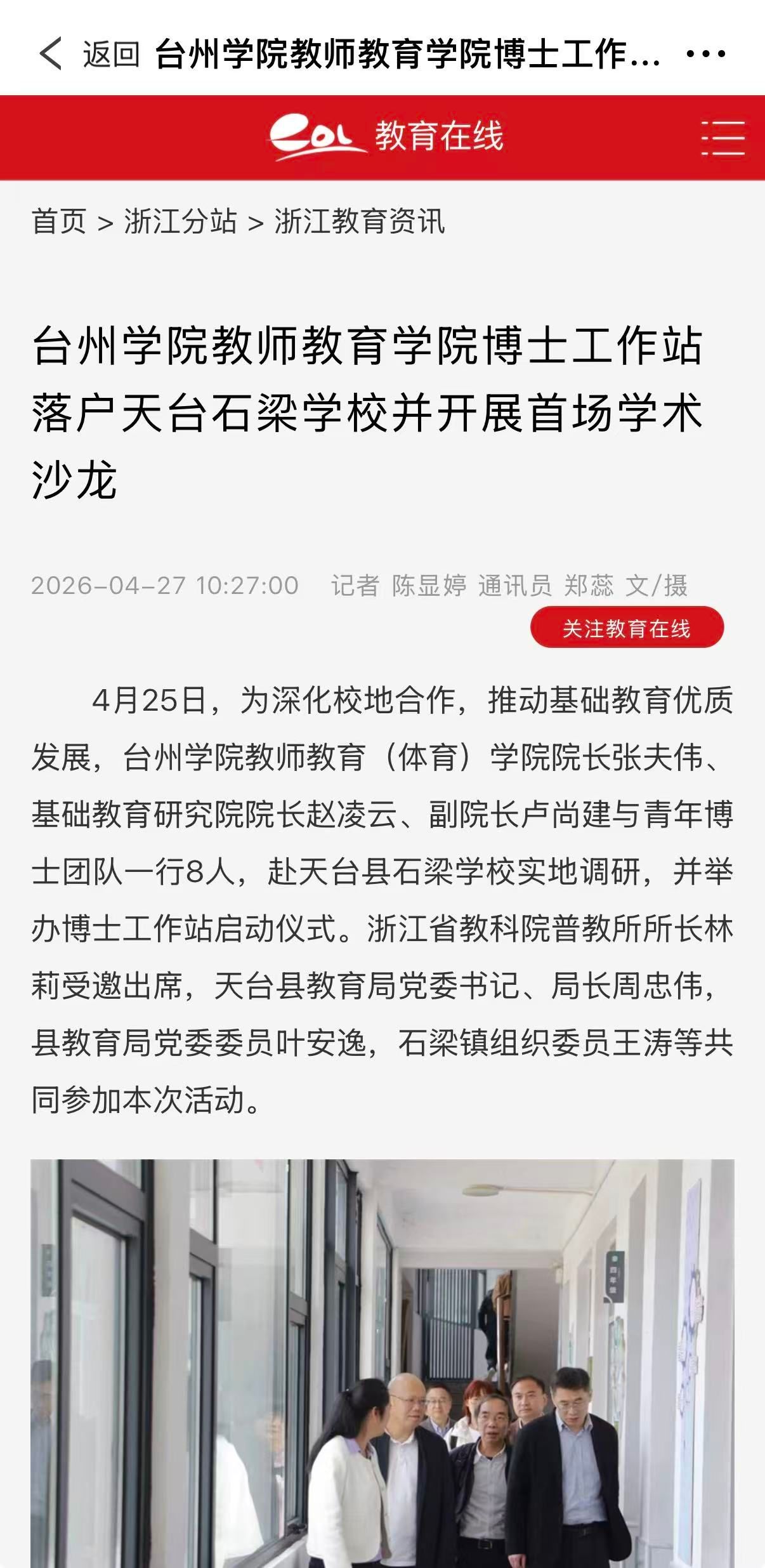 4月25日,为深化校地合作,推动基础教育优质发展,台州学院教师教育(体育)学院院长张夫伟、基础教育研究院院长赵凌云、副院长卢尚建与青年博士团队一行8人,赴天台县石梁学校实地调研,并举办博士工作站启动仪式。浙江省教科院普教所所长林莉受邀出席,天台县教育局党委书记、局长周忠伟,县教育局党委委员叶安逸,石梁镇组织委员王涛等共同参加本次活动。