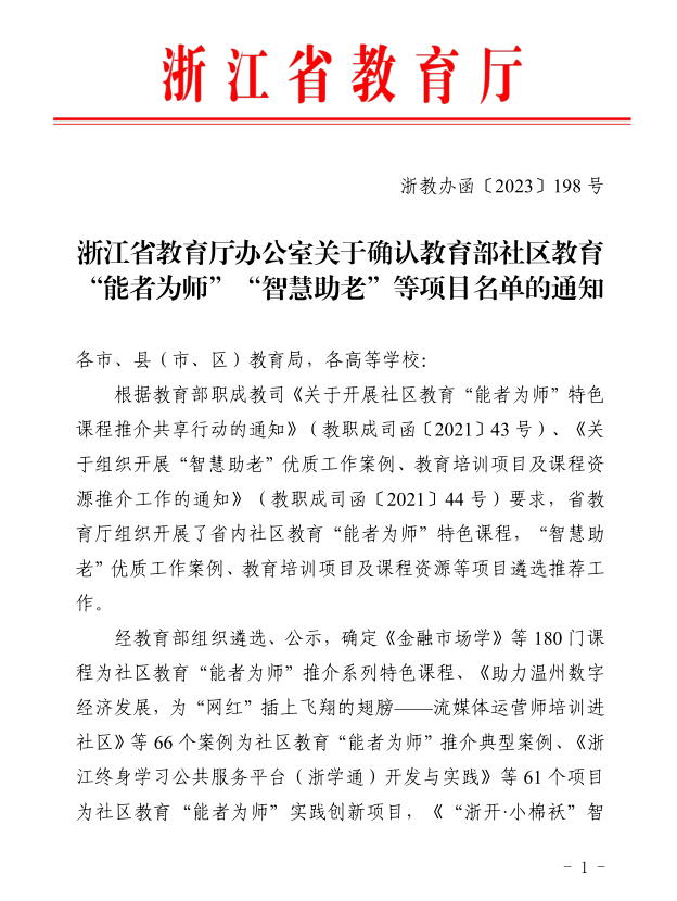 近日,《浙江省教育厅办公室关于确认教育部社区教育“能者为师”“智慧助老”等项目名单的通知》文件发布, 经教育部组织遴选、公示,浙江共有180门课程入选为社区教育“能者为师”推介系列特色课程、66个案例为社区教育“能者为师”推介典型案例、61个项目为社区教育“能者为师”实践创新项目,20个案例为“智慧助老”优质工作案例,45个项目为“智慧助老”优质培训项目、85门课程资源为“智慧助老”优质课程资源。