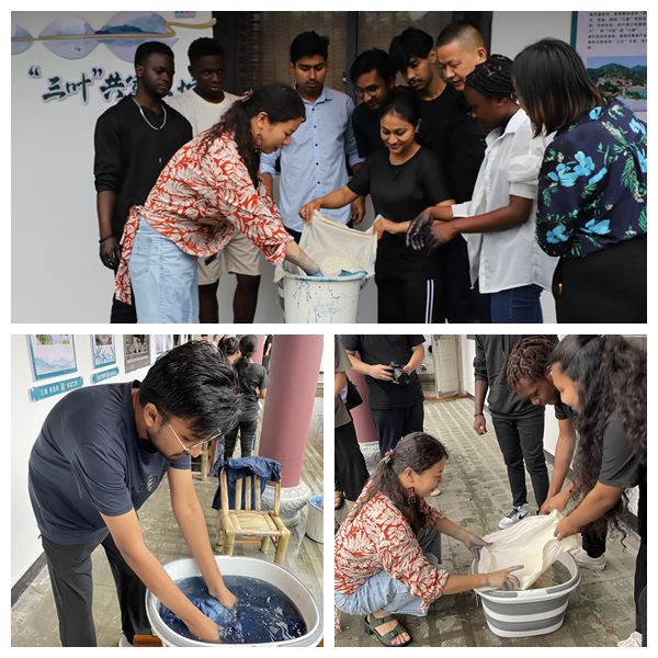 在非遗项目传承人张秀洁的带领下,留学生们学习了蓝花布印染技艺。他们好奇地询问制作步骤和染色原料,并动手体验了染色过程,看着桃子图案浮现于染布之上,留学生们不禁发出阵阵感叹。在上寺前村文化礼堂,留学生们亲手制作了蟠桃饮品,一边吃着蟠桃饭,一边欣赏非遗项目路桥花鼓传承人程春红等带来的花鼓表演,聆听新田理宣讲社成员陈婷和上寺前村党支部书记程香娇分享螺洋水心草堂设计规划和党建引领共富工坊建设的故事。迎亚运拔河比赛将当天的活动推向高潮,留学生代表队与村民代表队同台竞技,现场气氛热烈,加油声呐喊声不绝于耳。