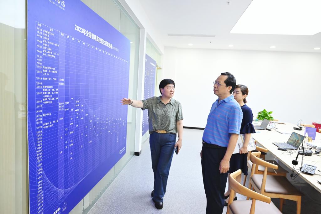 潘通天详细询问了学校今年生源计划分布情况和录取工作安排,实地察看了招生录取工作场所、机房和录取通知书封装现场,听取近阶段招生工作情况汇报。在学校2023年浙江省普通类第一段投档录取现场,潘通天逐一询问了各学院的录取情况,对招生录取工作有条不紊的开展表示肯定。