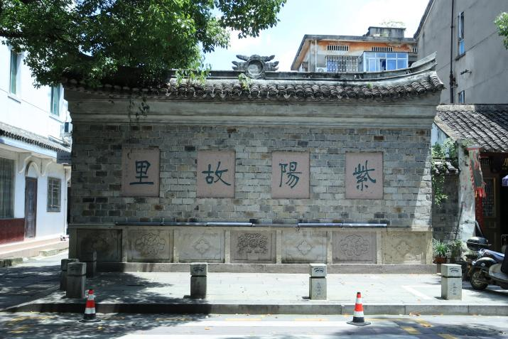 在紫阳街的最北端有一块照壁,上面写着“紫阳故里”四个大字,是原北京图书馆馆长、中国宗教界知名人士任继愈老先生亲笔题写的。紫阳故里是紫阳真人张伯端的故居。余敏娟老师介绍他是道教南宗始祖,修炼学说《悟真篇》,该学说奠定和发展了道教南宗的理论基础,是一部气功修炼方法和气功理论的集大成之作,被后代人奉为“丹法正宗祖经”,有“修丹之金科,养生之玉律”的美誉。所以宋代于紫阳故居建造紫阳楼,还建造了悟真桥、悟真庙,后雍正皇帝发帑敕建紫阳道观。紫阳道观的地址在原市教育局院内。道观坐北朝南,台门框架形似台州文庙,跨进台门,便是石板铺地的天井,天井北面就是紫阳宫,内设紫阳真人坐像,紫阳宫后面竖立着雍正御书《道观碑文》石碑,今存放在东湖石刻碑林内。