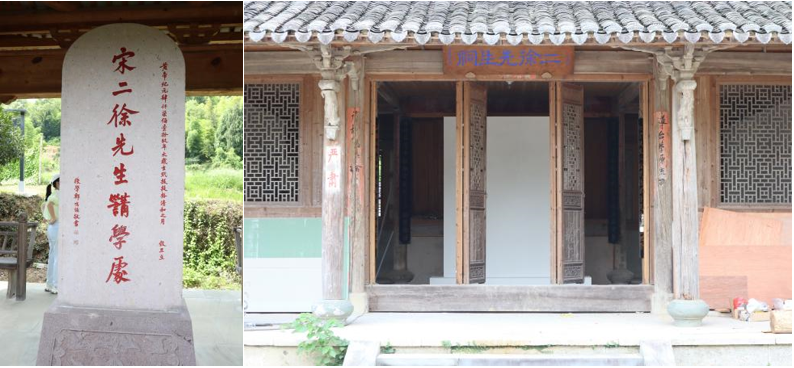 沿江之旅的首站,队员们来到了下百岩村。下百岩村坐落于山脚,周围是群山环绕。村子的历史上曾出过“二徐先生”。“二徐之墓”被列为临海市文保单位,当地人还修建了一座“二徐书院”。“二徐书院”在一畦坡地间,那是一座灰砖黑瓦的园林式别院。书院墙面分别刷有“二徐乡中心小学”和“下百岩小学”字样,可见曾经历史的痕迹,感受浓厚的文化气息。离书院近百米,狮岩山北麓有一处古墓,拾陡峭的石级而上,“二徐之墓”便在眼前。二徐即徐中行、徐庭筠父子,父被称为“大徐先生”,子被称为“小徐先生”。二徐生前和死后,都得到了欧阳修、朱熹、杨敬德、阮元、翁同和等历代名人、政要的高度评价,二徐在台州大兴教育,因而名垂青史。在墓前,队员们肃然起敬,心中默念:“二徐先生,安好!”
