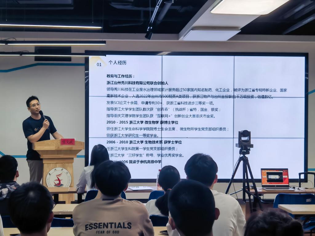 周瑶为张文武颁发创业导师聘书。张文武以幽默诙谐、通俗易懂的语言分享了拥有高学历的自己走上科技创业的原因。针对如何师生共创开展创业,他认为要具备商人思维,注重团队合作,维护积极的人际关系,积极寻求“贵人”帮助。