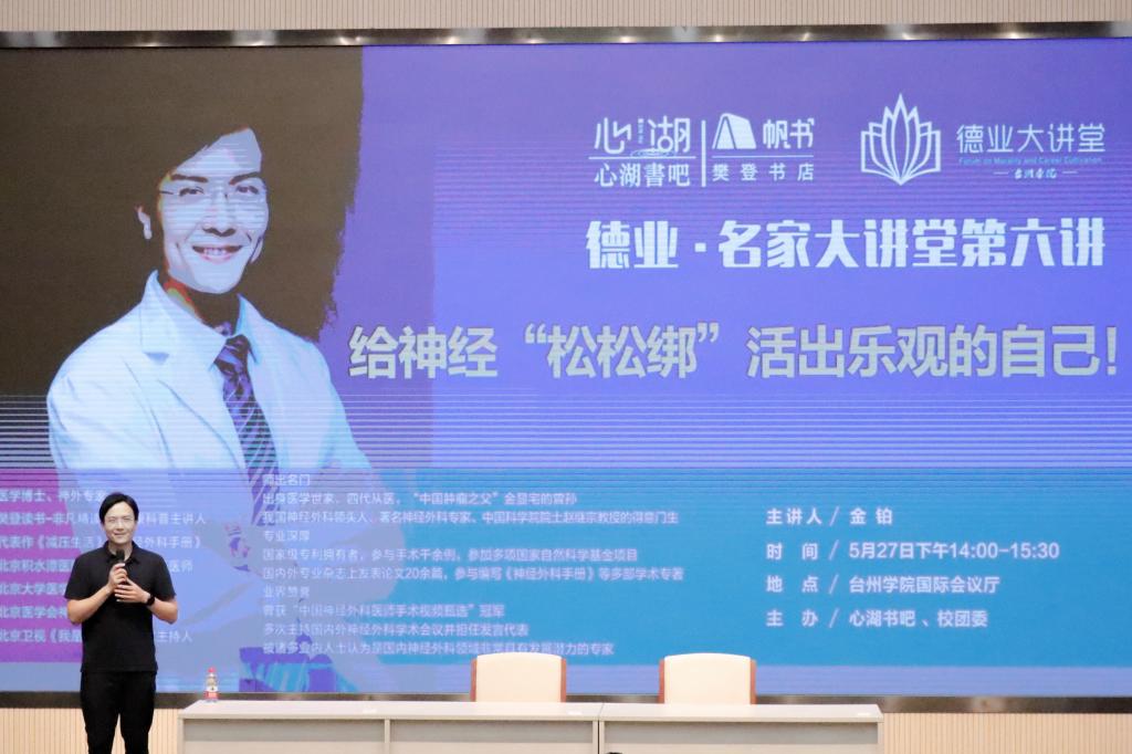 5月27日下午,樊登读书主讲人、畅销书《减压生活》作者、北京积水潭医院神经外科专家金铂老师应邀走进德业·名家大讲堂,在椒江校区国际会议厅作《给神经“松松绑”活出乐观的自己》专题讲座,校党委副书记金先龙,两百余名台州市民和校内师生聆听了报告。