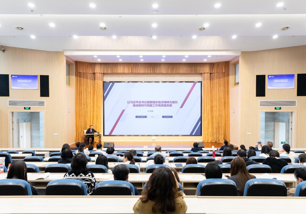 王正作题为《档案工作大有可为、应当大有作为、关键事在人为》的讲话。他指出,档案工作是一项基础性工作,经验得以总结,规律得以认识,历史得以延续,各项事业得以发展,都离不开档案。高校档案工作承担着“存史、资政、育人”的职责和使命,各归档单位要以对党负责、对历史负责、为现实服务、替未来着想的态度,用高质量的档案管理,服务学校的高质量发展。要全力做好学校档案的收集、保管、利用和信息化等工作,把蕴含学校办学初心使命的各类档案保管好、利用好,把新时代学校党委带领全校师生“升大、升博、创一流”的奋斗历程记录好、留存好。王正对做好学校档案工作提出要求:一是抓好资源建设这个基础,建立数量充分、质量优化、门类齐全、结构合理的档案馆藏体系;二是抓好服务利用这个核心,聚焦学校中心任务、重要决策和师生需求,找准档案工作的定位和服务大局、服务师生的着力点,积极主动作为;三是抓好安全保障这个根本,关注库房安全,强化上网档案信息审查,恢复档案数据异地异质备份,建构安全防范体系;四是抓好数字档案这个关键,积极开展档案数字化改革、数据安全保护等方面研究,加快推进新技术在档案开放、档案展览、文献编研、档案可视化等领域的应用。
