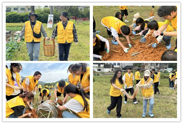 第一站——齐心搭土窑挖土豆,体验劳动之美。活动伊始,同学们按照向导讲解的“土窑搭建攻略”,分成4个小组,纷纷运用专业特长,各司其职,有的提水、有的搬运泥土、有的精心设计土窑造型,用泥土、石头、稻草这些简单天然的材料搭建土窑。随着土窑的初具成型,同学们来到土豆田,拿起小锄头,开启“寻豆”之旅。经过一个小时的田间劳作,同学们与土豆结下了不解之缘。挖出的土豆大的饱满,小的可爱,大家迫不及待地把这些大大小小的“金色蛋子”清洗干净,放进搭建好的土窑里,等待“原味土豆”的出炉。