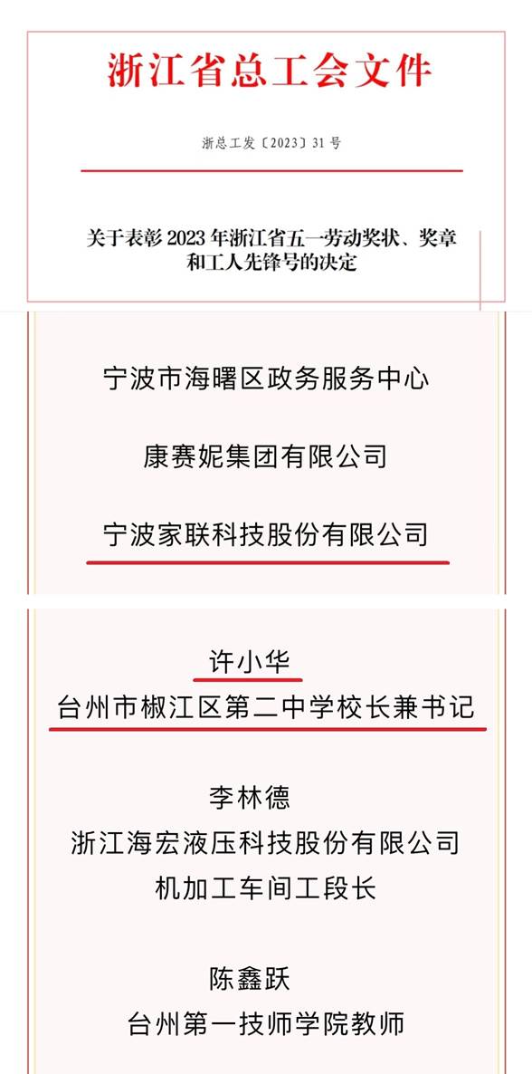 近日,浙江省总工会正式发文,公布了《关于表彰2023年浙江省五一劳动奖状、奖章和工人先锋号的决定》。其中,我校88届化学专业校友王熊创办的企业宁波家联科技股份有限公司、90届数学专业校友许小华分别荣获“2023年浙江省五一劳动奖状”和“浙江省五一劳动奖章”。