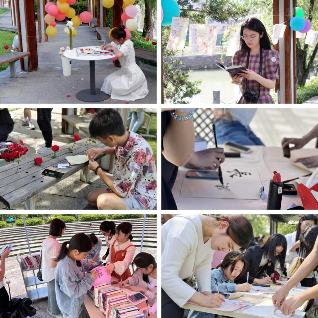 阅读活动以打卡通关的形式进行,参与者们领取书海卡,集齐四个印章,就可以领取教师捐赠的书籍盲盒。活动共设四个朗读打卡点:在校标古诗文朗读亭处,一首首或含蓄或豪放的古诗文,凝聚着中国千年的风雅和浪漫;在静溪长廊现代诗朗诵亭处,各大流派、各种风格的诗歌都展现着它们的赤忱;在散文朗诵亭处,大家在充满情调的紫藤花下与散文邂逅,在不经意间留下难忘的回忆;在大圆盘小说朗读亭,我们在动人的故事中穿梭,和书中各色的人物相遇。另外,还有“书写经典”“取词写诗”“以文会友”及“小说我来猜”活动,同学们或泼墨挥毫,或沉思吟咏,一个个香囊,一朵朵玫瑰,是对书海徜徉的人们最好的馈赠和奖赏……不论是老师同学,还是志愿工作者,都沐浴在明媚的春光下,沉浸在朗朗的书声中,畅读畅听畅想,与名著对话,与经典交流。