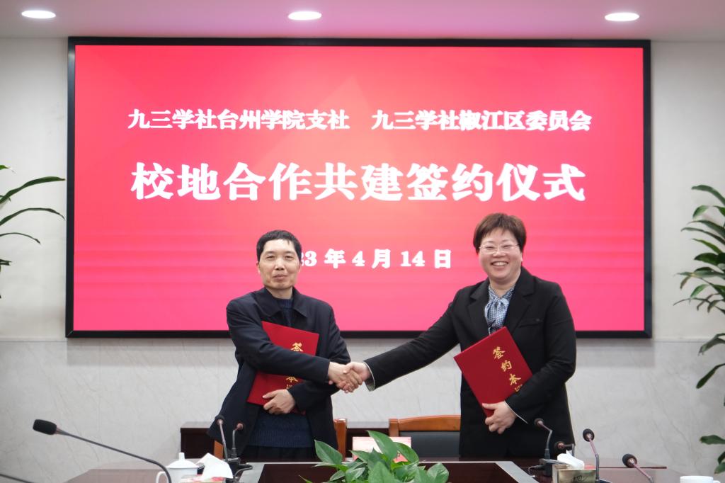 4月14日,校九三学社支社与九三学社椒江区委会校地合作共建签约仪式在椒江校区举行。校党委副书记潘通天,台州市政协副主席、九三学社台州市委会主委李立飞应邀出席并讲话。椒江区人大常委会副主任、九三学社椒江区委会主委李越,校党委统战部部长蔡海江参加签约仪式,九三学社市委会副主委张永炬主持仪式。