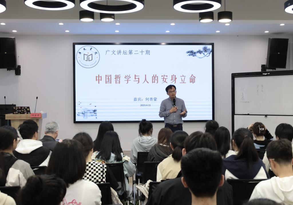 4月11日晚,广文书院在多功能厅举行了以“中国哲学与人的安身立命”为主题的第20期广文讲坛。浙江大学哲学学院教授、博士生导师何善蒙担任主讲嘉宾,大田中学老师王志顺、胡文焘,广文书院辅导员黄廷美,书院学员和部分大田中学学生参加此次活动,广文书院院长胡正武主持。