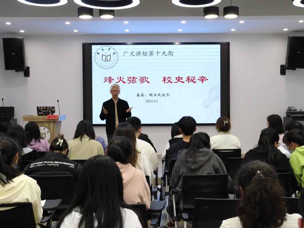 4月1日晚,广文书院在多功能厅举行了以“烽火弦歌,校史秘辛”为主题的第19期广文讲坛活动。广文书院院长胡正武应邀担任主讲嘉宾,广文书院辅导员黄廷美及部分书院学员参加,学工部副部长马斌主持。