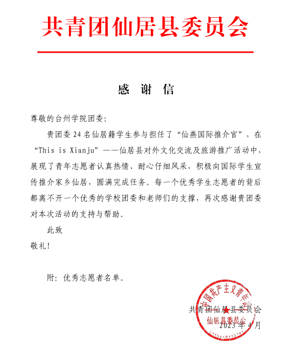 据悉,本次活动我校团委共招募了 24 名仙居籍学生参与担任 “仙燕国际推介官”,在“This is Xianju”——仙居县对外文化交流及旅游推广活动中,大学生们展现了青年志愿者认真热情、耐心仔细风采,积极向国际学生宣传推介家乡仙居,圆满完成任务。校团委还收到仙居团县委的感谢信,充分肯定了校团委的选拔推荐工作。