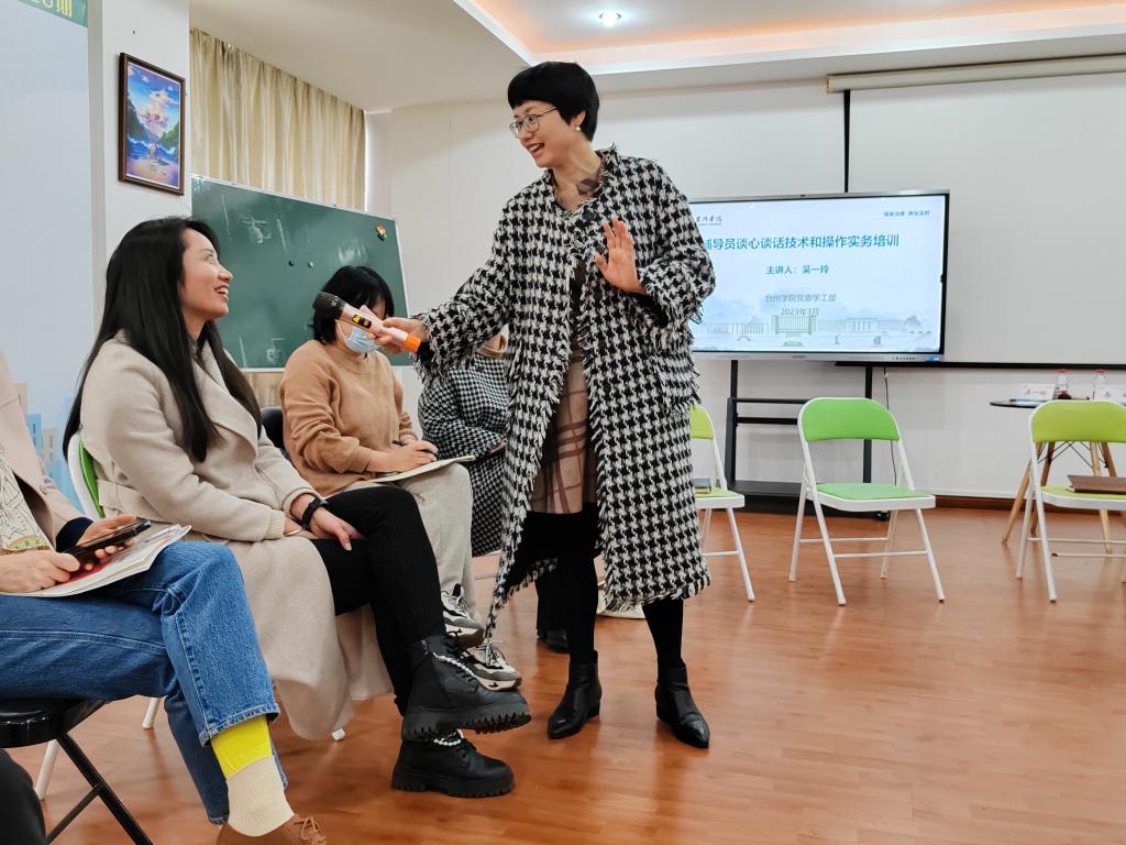 吴一玲结合高校师生谈心谈话实操,从言语沟通与非言语沟通、心理谈话目标与适用范围、心理助人谈话要点与演练、心理危机谈心谈话演练等方面细致展开讲解,强调了谈心谈话时要关注到学生的身体情况(眼神、面部表情、动作等),也要关注学生的心理情况(认知、情绪情感、意志等),同时用生动的案例展示了心理助人谈话与教育管理谈话的差别。为增强培训效果,吴一玲现场请老师们进行分小组讨论和实操演练,通过实践训练,老师们对谈心谈话技术有了更为直观深入的理解和运用。