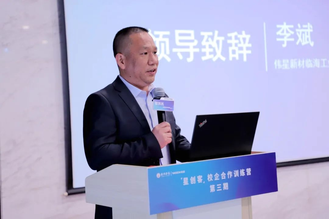 李斌感谢台州学院为伟星输送了大量优秀人才、技术和管理骨干。他指出“星创客”搭建了人才培养的“直通车”,让“新伟星人”更早了解伟星文化、伟星团队、伟星事业,后续将有针对性地开展系列特色人才培养计划。他表示台州学院作为伟星的“芳乡近邻、亲密伙伴”,期望能进一步拓展校企合作领域,创新校企合作模式,也希望学员能快乐学习,学有所获。