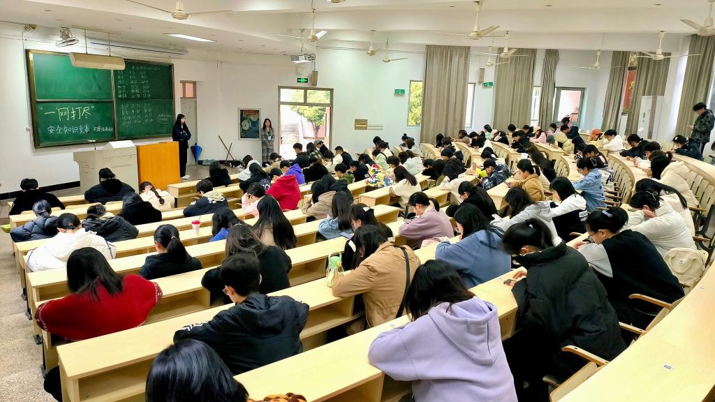 本次测试结合我校安全保卫工作的实际情况,设置了门槛题、单选题、多选题、判断题、填空题和简答题共六大题型,48道小题,限时60分钟。试卷内容包含防诈骗、防盗窃、消防安全、交通安全、国家安全、禁毒教育、法制教育等,涵盖知识面广,多方面、多角度考察了同学们的综合安全素养,提高了同学们对人身安全和财产安全等方面的关注度,进一步引导同学们思考如何加强校园安全建设,深入体会保护校园安全的必要性和重要性。伴随着答题信号的发出,同学们立刻沉着冷静地进行答题。监考人员在选手们间穿梭巡逻,维护了考场的秩序,使得此次竞赛得以顺利进行。