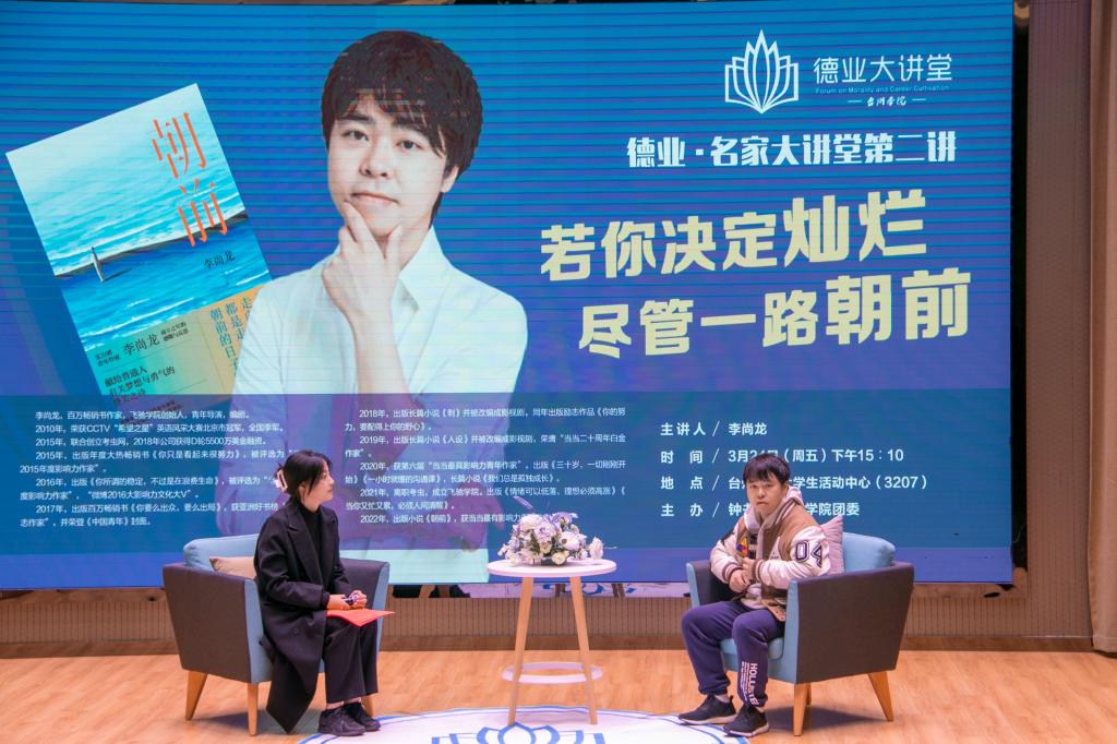 3月24日下午,“德业·名家大讲堂”系列讲座第二讲在椒江校区大学生活动中心开讲。百万畅销书作家、橙啦app首席内容官李尚龙应邀做客本次活动,作《若你决定灿烂 尽管一路朝前》专题讲座,椒江校区各二级学院师生和市民代表近两百人到场聆听。