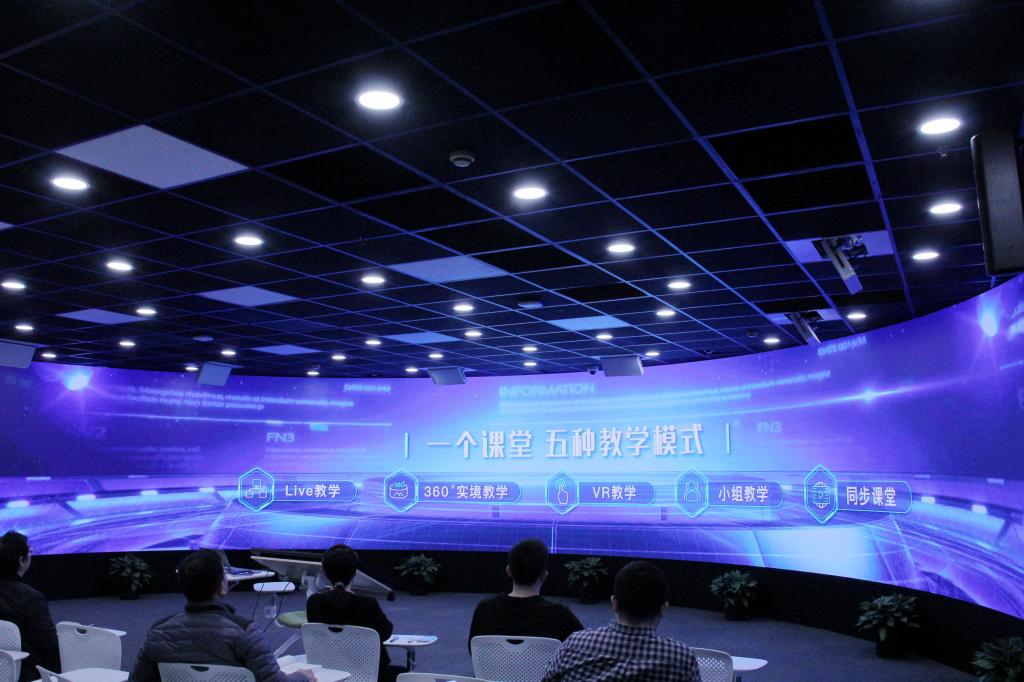 工程师为老师们详细介绍和演示了全景教室的Live教学、360°实境教学、VR教学、小组教学、同步课堂五种教学模式,直观形象地说明了全景教室的特点和优势。参会老师积极提问,并现场体验了220°宽屏板书书写、小组互动教学、60人线上live教学的实际效果。