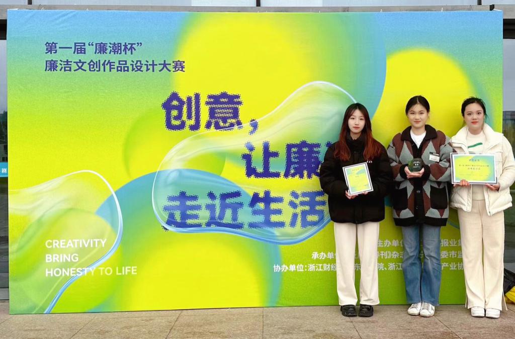 3月17日下午,浙江省首届“廉潮杯”廉洁文创作品设计大赛颁奖仪式及优秀作品展在浙江财经大学东方学院举行,艺术与设计学院学生崔睿芳、徐佳佳、蒋宇欣荣获大赛银奖。台州学院荣获优秀组织奖。