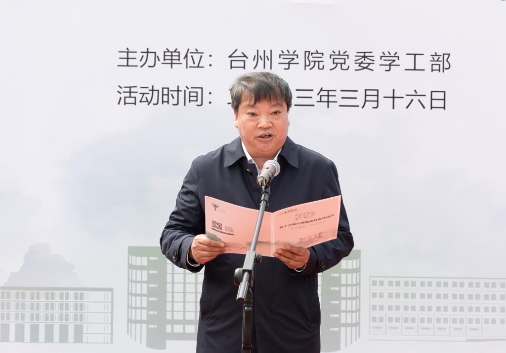 3月16日下午,校第十九届“心理健康教育活动月”启动仪式在椒江校区至善广场举行。校党委副书记金先龙致辞,校党委委员、宣传部部长金松,学工部部长张梅芬,后勤服务管理处处长庞宪洪,保卫处处长杨启富,团委书记潘垚出席,学工部副部长王林军主持。校心理健康教育与咨询中心老师、大学生心理健康互助中心成员及学生代表等近300人参加启动仪式。