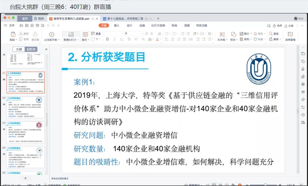 为进一步提升“挑战杯”参赛项目的质量,引导参赛学生科学备战省赛,力争赛事成绩取得突破,3月8日-10日,校团委针对哲学社会科学调研报告、自然科学学术论文、科技发明制作等三个赛道,分别以线上讲座、线下交流指导等多种形式开展“挑战杯”省赛推荐项目的打磨工作。“挑战杯”赛事专家、宁波大学特聘研究员李一,宁波大学先进涂层与增材制造研究所副所长曹均,浙江农林大学化材学院党委副书记宋春春根据分别对参赛项目进行一对一打磨指导。各参赛团队负责人、指导老师等参加讲座与交流。
