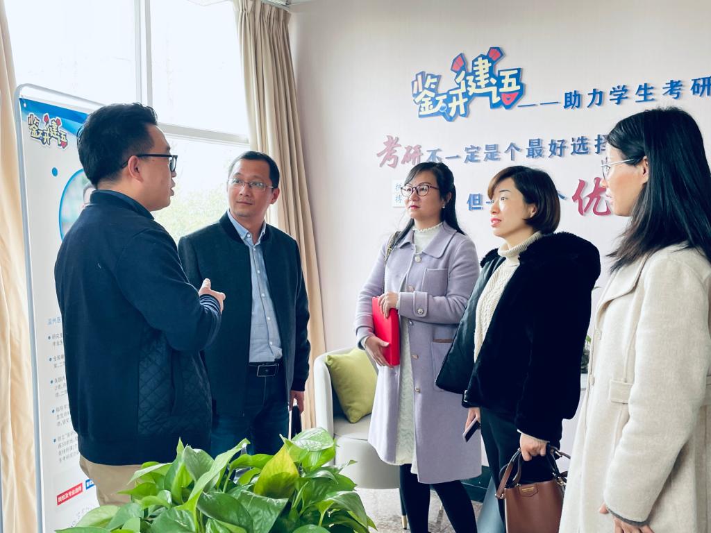 在温州医科大学,温医大学工部副部长郑节霞从重保障、提能力、促成长等方面介绍了辅导员队伍建设情况;学工部副部长卢益东从四度发力,助推毕业生高质量就业出发介绍了就业工作情况。双方就队伍建设岗位津贴、职称评定、慢就业不就业等痛点难点进行深入探讨和学习。随后参观了心桥辅导员工作室,详细了解了鉴研健语考研工作室的运作模式。