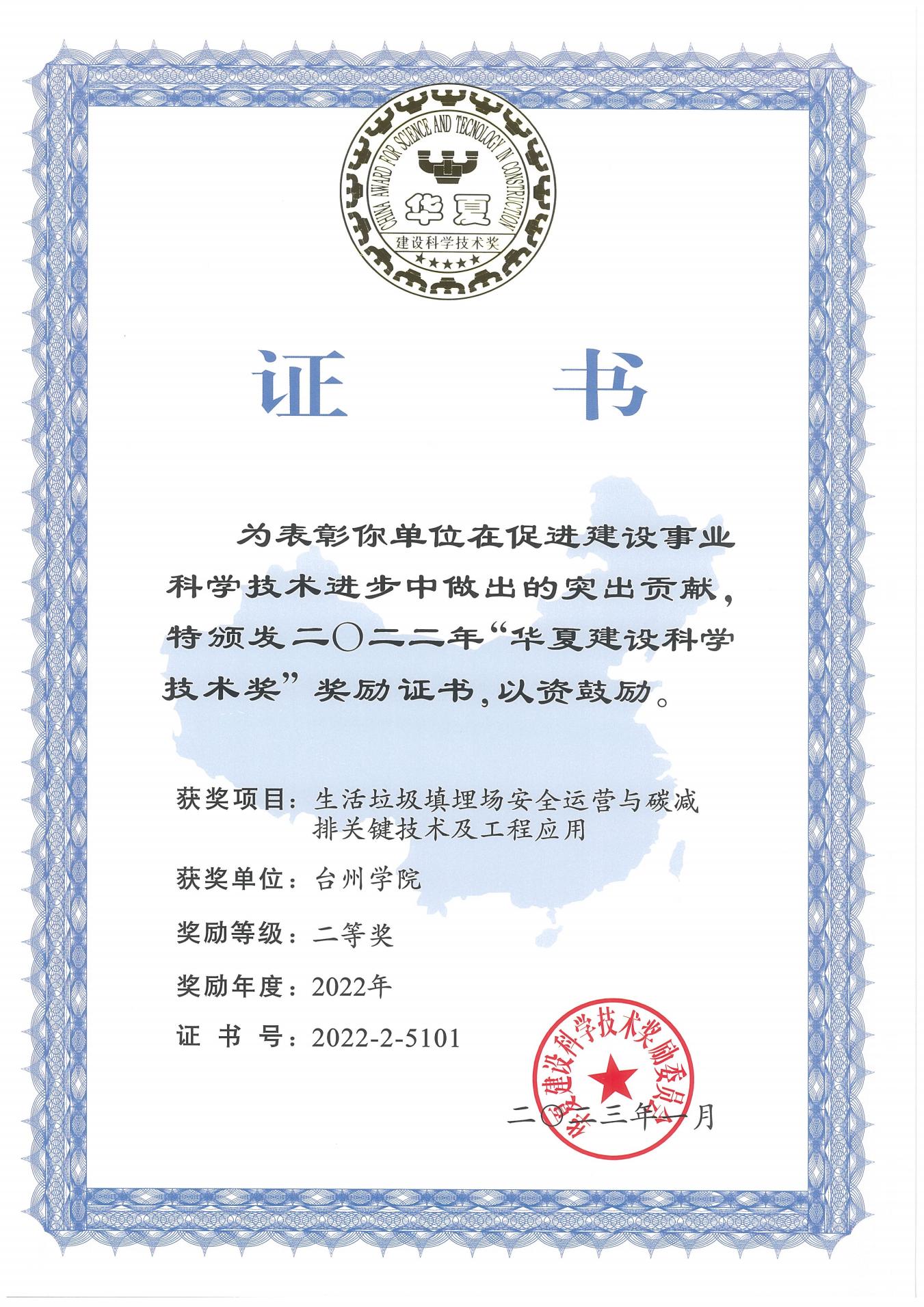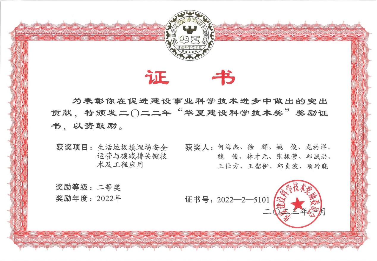 住房和城乡建设部科技与产业化发展中心于1月28日发布了“2022年度华夏建设科学技术”评选结果公告,由我校建工学院何海杰副教授、姚俊教授、王仕方教授等为主要完成人的“生活垃圾填埋场安全运营与碳减排关键技术及工程应用”成果,荣获二等奖。该成果由台州学院牵头,联合浙江理工大学、中国矿业大学、中国电建集团华东勘测设计研究院有限公司、浙江省隧道工程集团有限公司等单位完成,这也是本校首次牵头获得此次奖项。