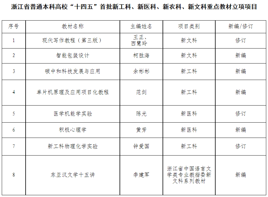 近日,浙江省高等教育学会公布了浙江省普通本科高校“十四五”首批新工科、新文科、新医科、新农科重点教材建设项目,我校8部教材成功入选省级重点教材立项建设名单,其中7部教材为高校申报项目,1部教材为教指委申报项目。