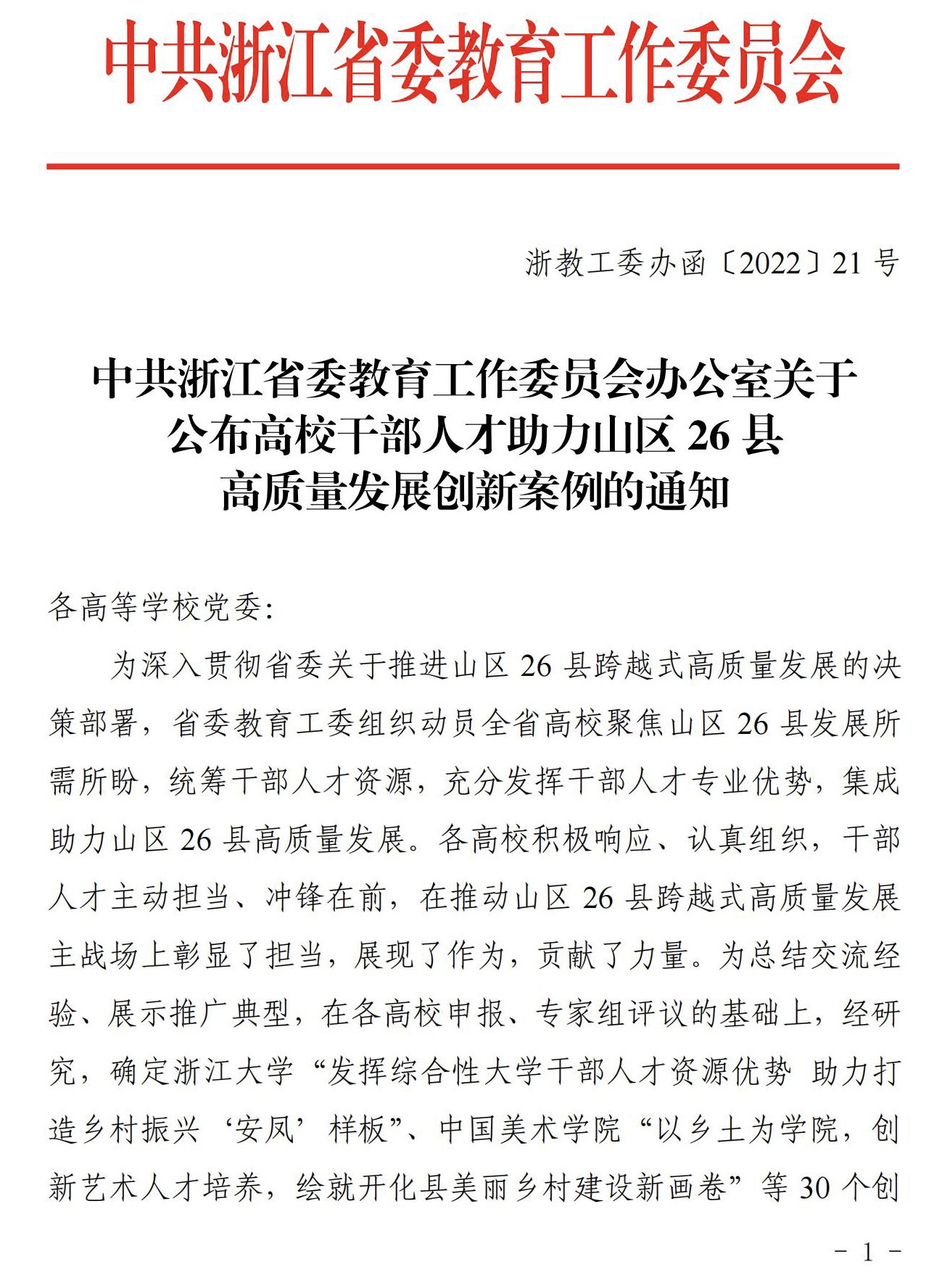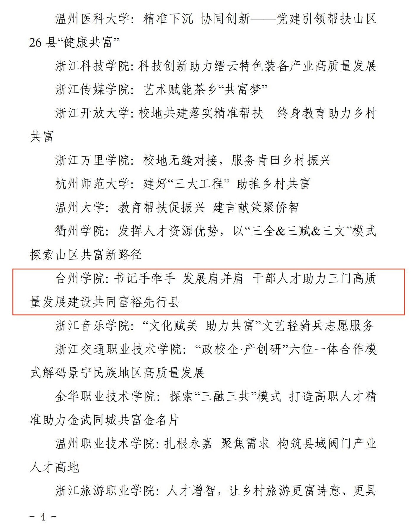近日,中共浙江省委教育工作委员会办公室印发《关于公布高校干部人才助力山区26县高质量发展创新案例的通知》,我校《书记手牵手 发展肩并肩 干部人才助力三门高质量发展建设共同富裕先行县》成功入选。
