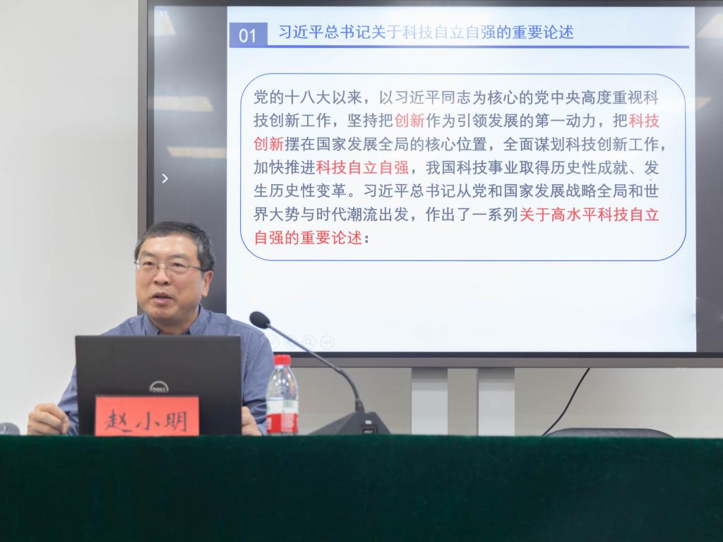 10月24日下午,校党委委员、副校长赵小明以“勇立潮头 为加快实现高水平科技自立自强努力奋斗”为主题为材料科学与工程学院师生党员上专题党课。学院党总支书记吴建波主持,师生党员、研究生参加。