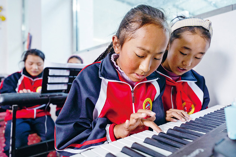 图为2023年6月5日,在西藏日喀则定日县扎西宗乡完全小学,四年级三班的旦增吉宗(前排左)正在和小伙伴上钢琴课。钢琴课是该校16个兴趣班之一。为了满足学生们的各种需求,学校设置了信息技术、美术、广播、体育、舞蹈、手工等兴趣班,促进学生全面发展。 新华社记者 费茂华/摄