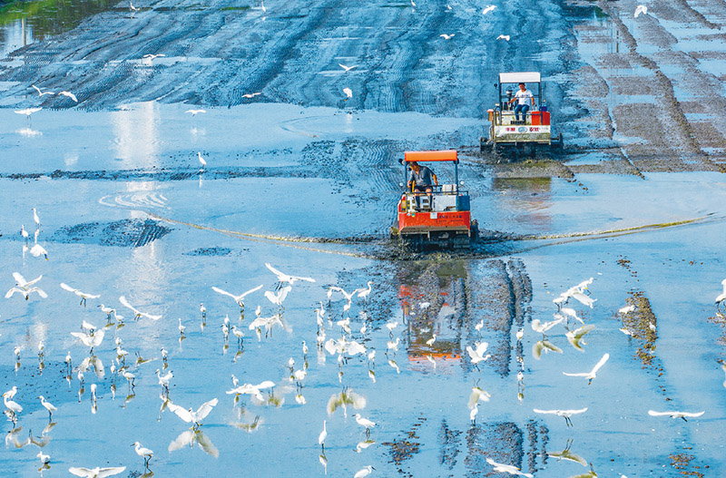 以当代中国人权观为指引,我国不断加强环境权利保障力度,取得了显著成效。图为2023年7月2日,在安徽芜湖弋江区义兴村,农民正驾驶拖拉机翻耕农田,成群的鹭鸟伴随着耕作的拖拉机翩翩起舞,构成一幅美丽和谐的生态田园画卷。 人民图片 肖本祥/摄