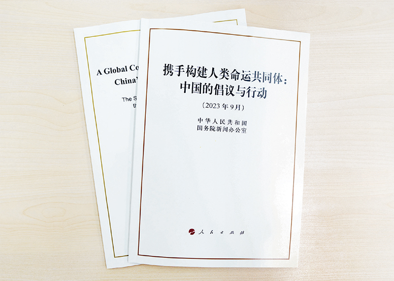 2023年9月26日,为全面介绍构建人类命运共同体的思想内涵和生动实践,增进国际社会了解和理解,凝聚广泛共识,更好与各国携手构建人类命运共同体,国务院新闻办公室发布《携手构建人类命运共同体:中国的倡议与行动》白皮书(中、英文版)。 新华社记者 才扬/摄