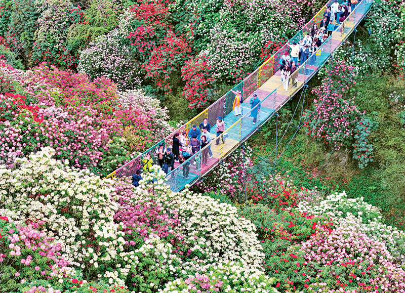 发展绿色生产力,坚持绿水青山就是金山银山理念,推动经济社会发展全面绿色转型,是满足人民日益增长的优美生态环境需要的必然要求。图为2024年4月4日,游客在贵州省毕节市百里杜鹃景区踏青赏花(无人机照片)。 新华社发 李华/摄