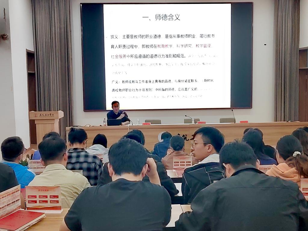 江岳军阐释了现代师德的含义,用“一票否决”、“第一标准”、“准入制度”、“社会性死亡”、“顶格处理”等关键词,强调了违反师德问题处理的严重性,并列举了本校和部分高校师德失范典型案例,提醒广大教师要以案为鉴、以案明纪,时刻自省。林月村结合中国传统文化,导出“为学以乐、为人以正、为政以德”的中华民族思想,通过诸子百家运动会、五规五战管理、1359数字法则、水与海的关系等引经据典、旁征博引,阐释了中华文化内涵中所包含的丰富教育思想和伦理道德,将中华优秀传统文化的精髓与师德师风建设紧密结合,让教师们从国学视角重新审视师德师风,为加强现代教师师德师风建设提供了源源不断的智慧。