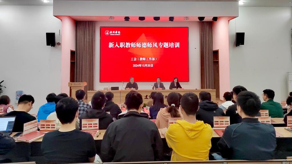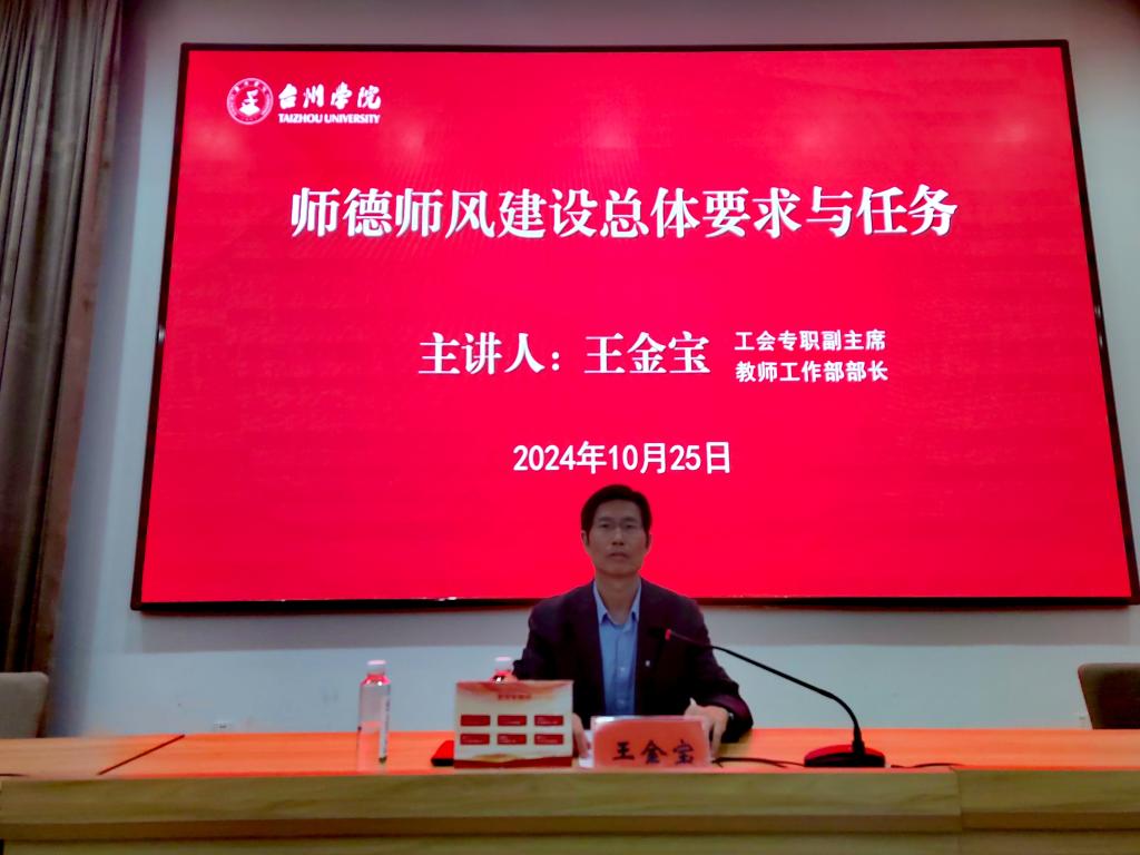 为全面贯彻习近平总书记关于教育的重要论述和全国教育大会精神,大力弘扬践行教育家精神,提升新入职教师专业素养和能力,涵养高尚师德、增强育人本领,建设高素质专业化教师队伍,我校于10月25日成功举办了新进教师师德师风教育活动。校工会专职副主席、教师工作部部长王金宝作《师德师风总体要求与任务》专题报告,原校工会专职副主席、教师工作部部长江岳军作《关于师德师风警示教育》报告,邀请台州市人民警察培训学校校长林月村作《国学智慧与修身立德》专题报告。工会副主席、教师工作部副部长朱晓弘主持会议。