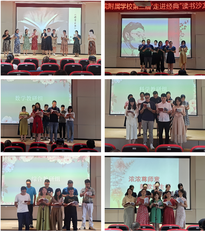 “多读书,读好书,善读书;立崇高理想,涵养浩然之气。”29日下午,校第三届“走进经典”读书沙龙活动拉开帷幕。活动以“智慧修炼”环节开始,围绕暑期研读的《傅雷家书》《智爱如阳光—百位班主任的育人故事》两本书,全体教师按教研组分成6队,进行24轮激烈的知识抢答。第二个环节是“七嘴八舌”,齐读经典,各队赛前精心设计,巧妙编排,精美配乐,书声琅琅,给大家带来了一场场视听盛宴。在“各抒己见”环节,12位老师代表各队一一上台与大家分享读书心得,梁萍老师将对傅雷的独到见解娓娓道来,李非老师讲述了自己的“智爱”教育故事,顾仙华老师畅谈育儿经,大家都分享了书本给自己带来的感悟。经过三轮较量,评委打分,最终语文组获得一等奖。在书香飘溢的大厅里,在场所有人都经历了一场心灵的洗礼。